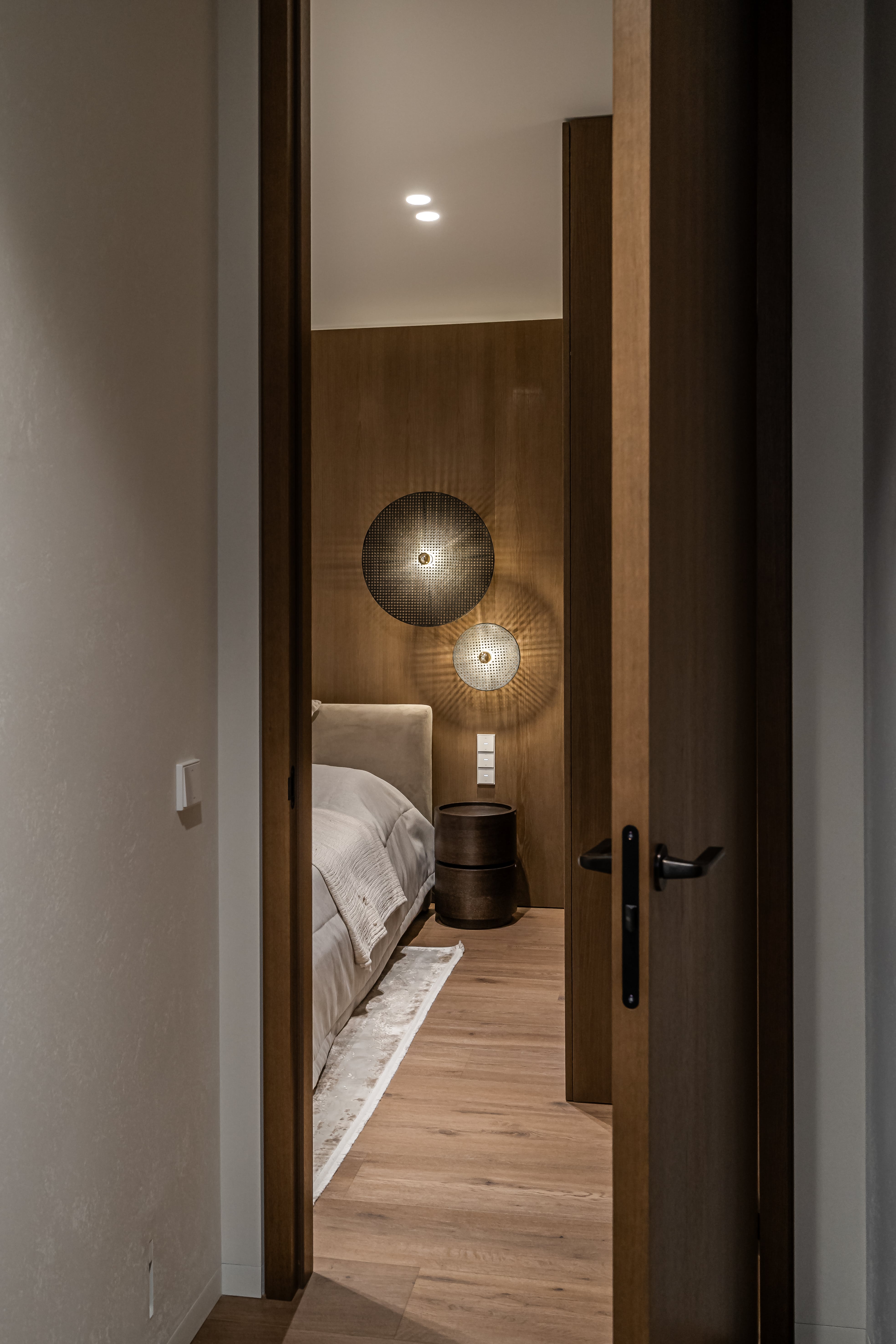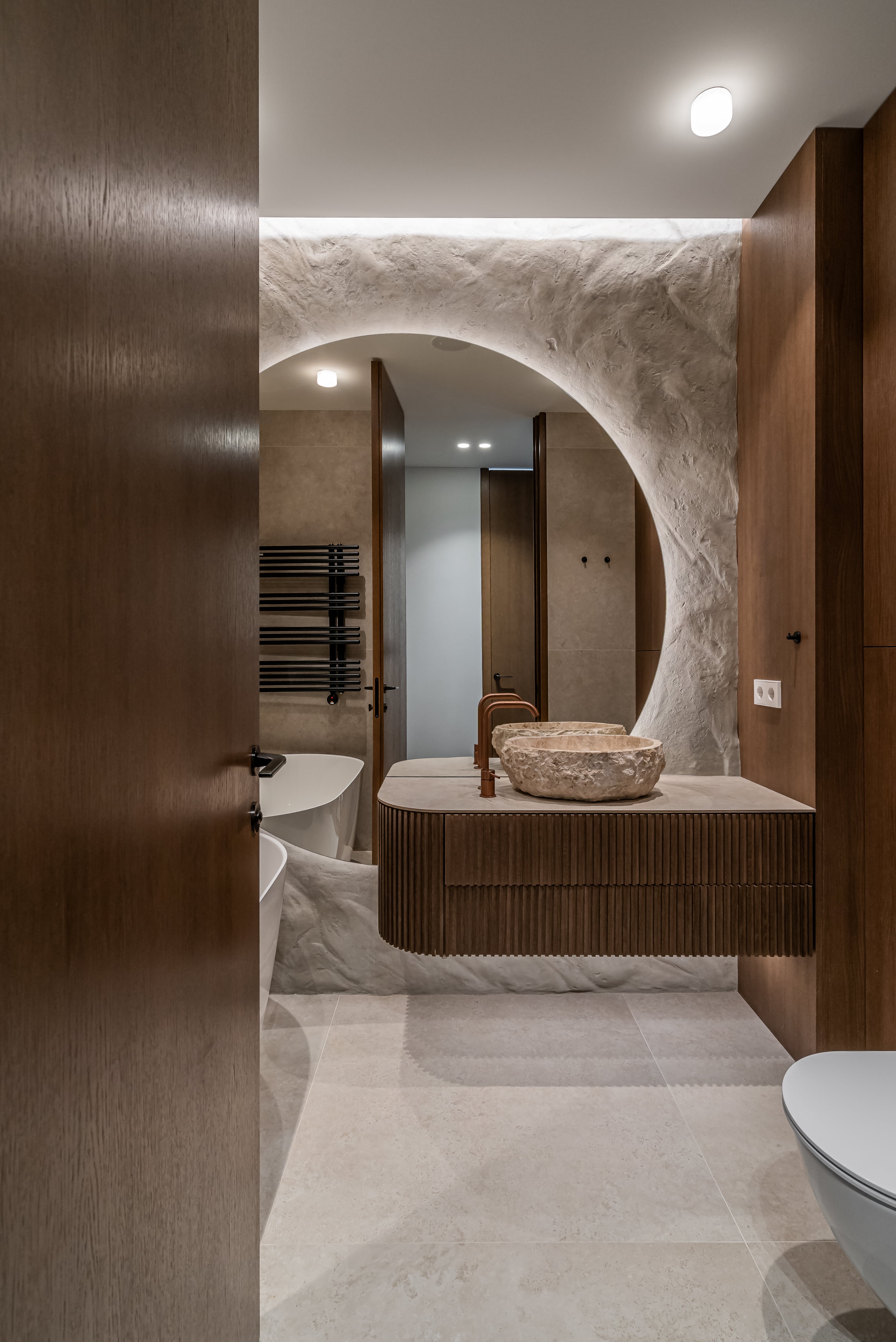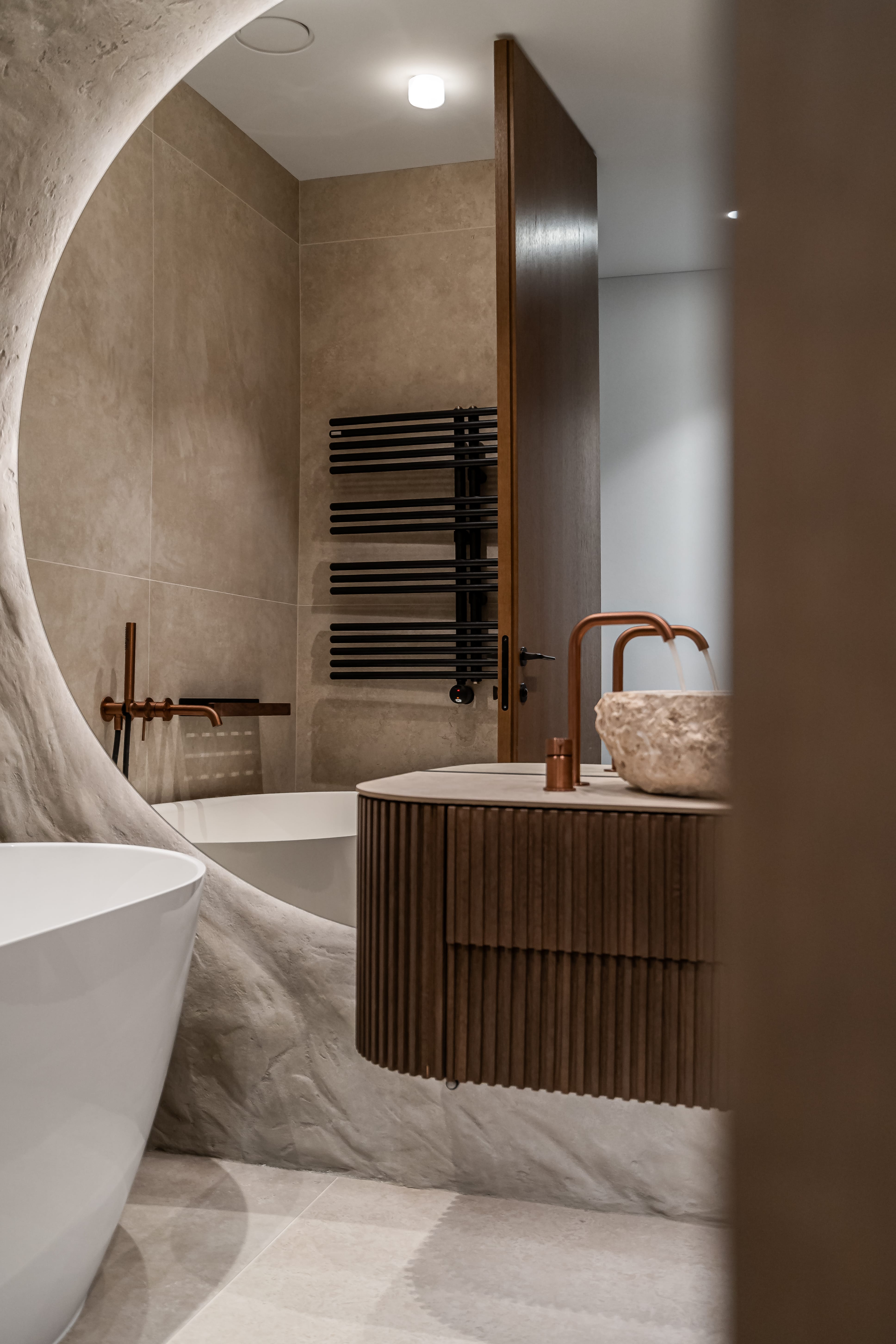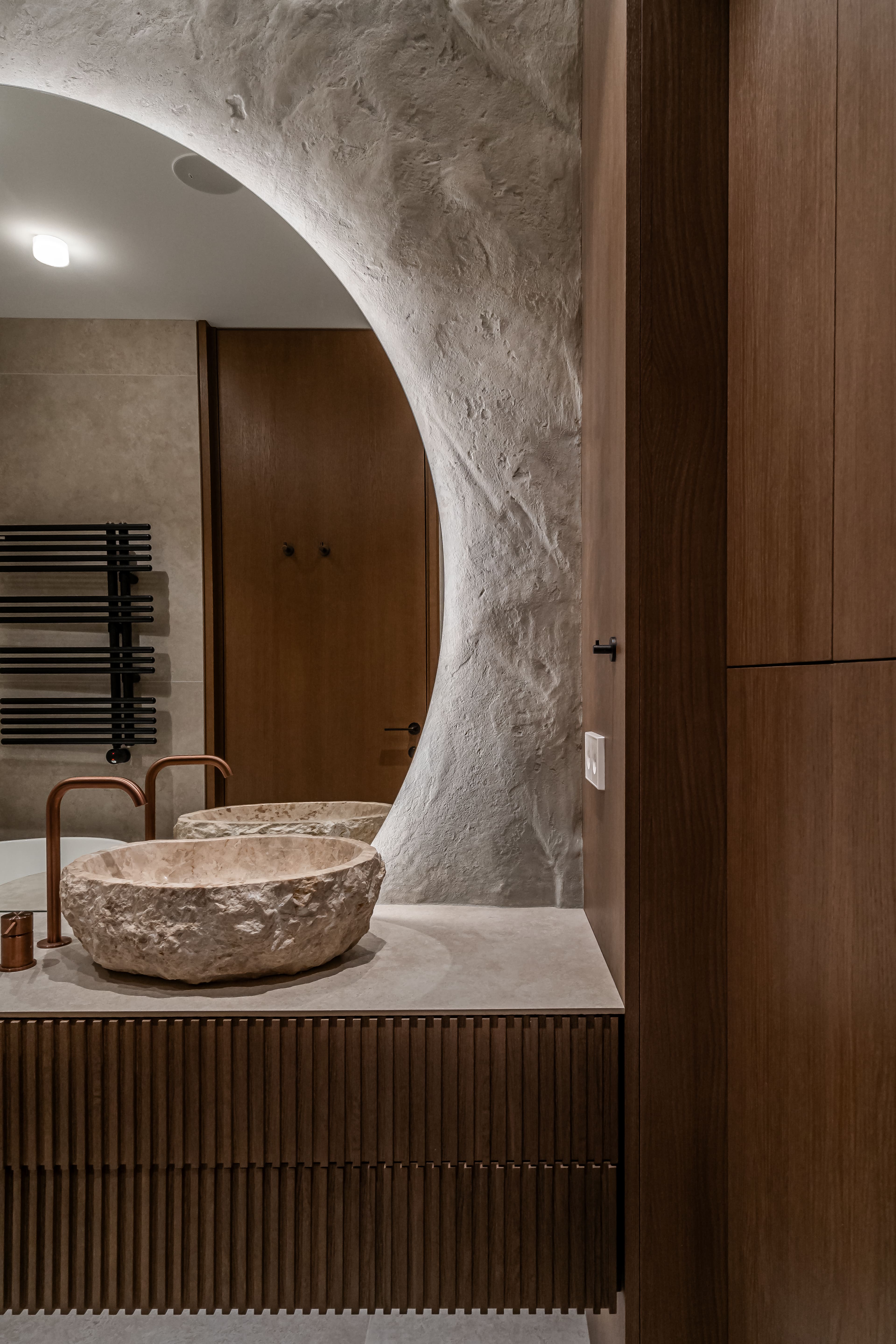 Beveik visi baldai šiame objekte gaminami pagal individualų užsakymą iš ąžuolo faneruotės, dengtos skirtingais beicais, nevengiamas plokštės lenkimas, medinių tašelių klijavimas. Voniose naudojama speciali uolienos efektą kurianti akcentinė sienų danga, ji derinama tiek su standartinio matmens, tiek su plačiaformatėmis akmens masės plytelėmis, beveik dviejų metrų skersmens veidrodžiu, spalvota santechnika PVD apdaila. Natūralūs tonai, medžio panaudojimas atsikartoja ir miegamojo kambaryje, kur kuriama jauki, gamtos motyvais paremta aplinka, kurioje gera pradėti ir baigti dieną.