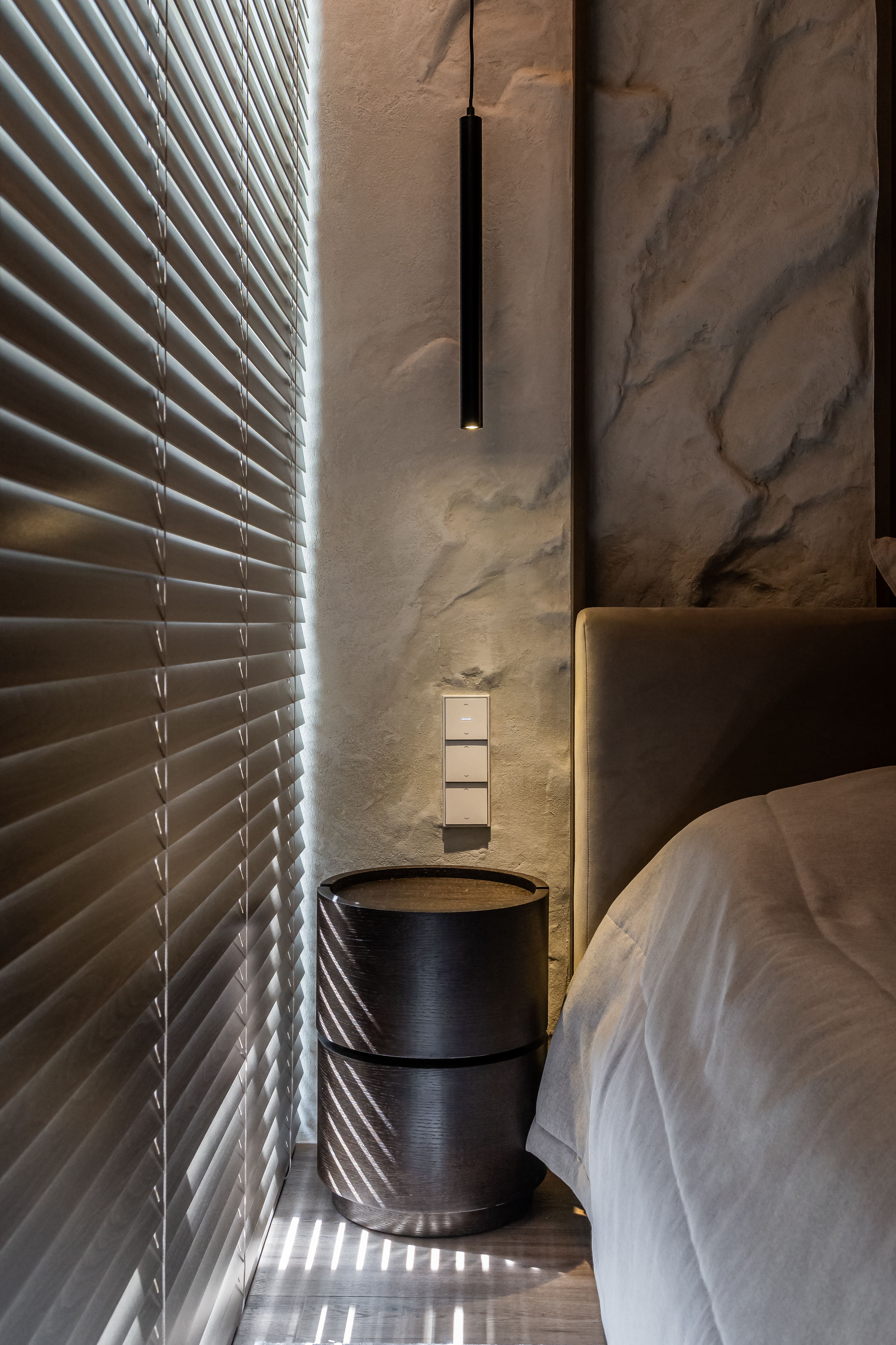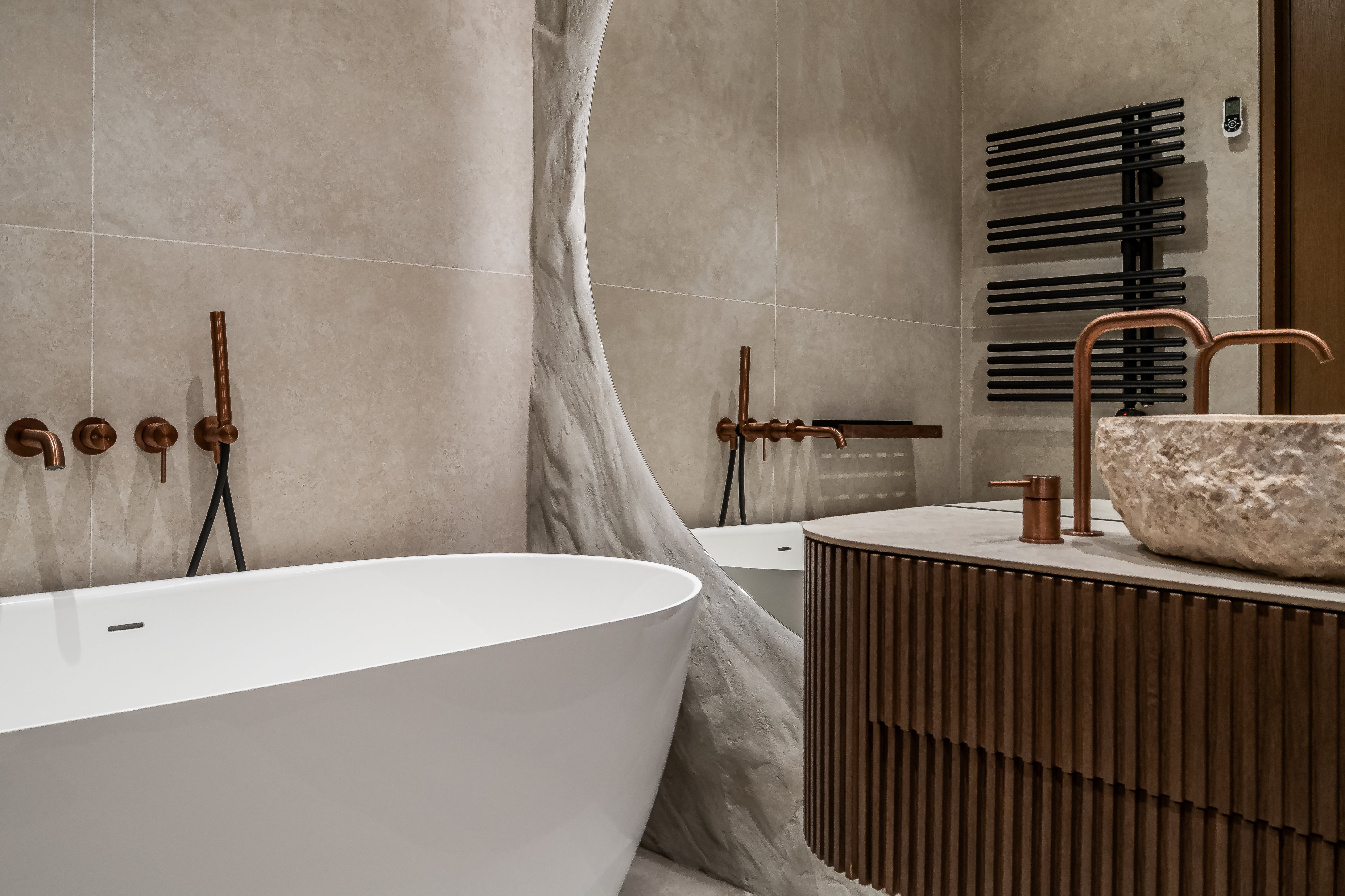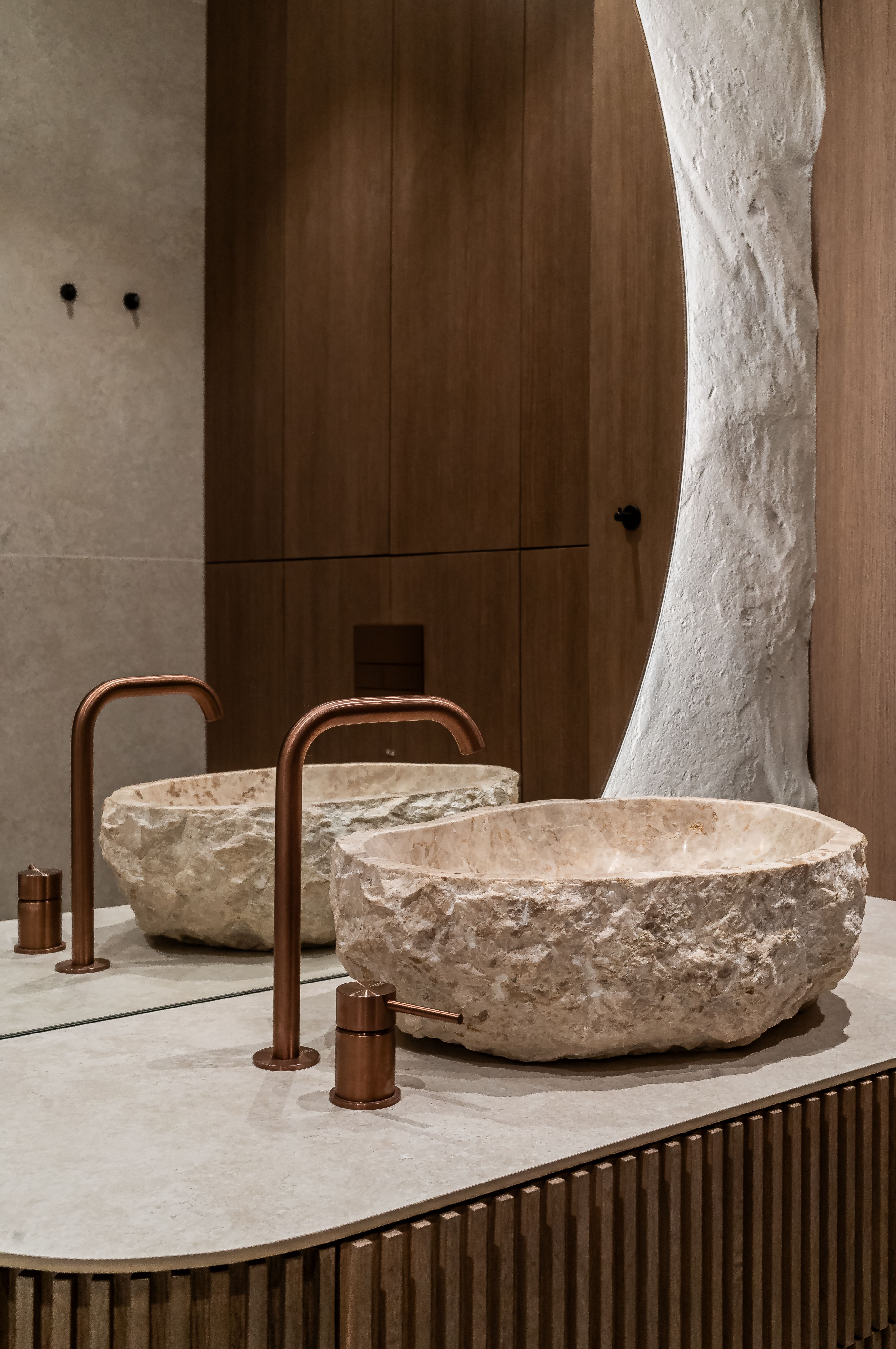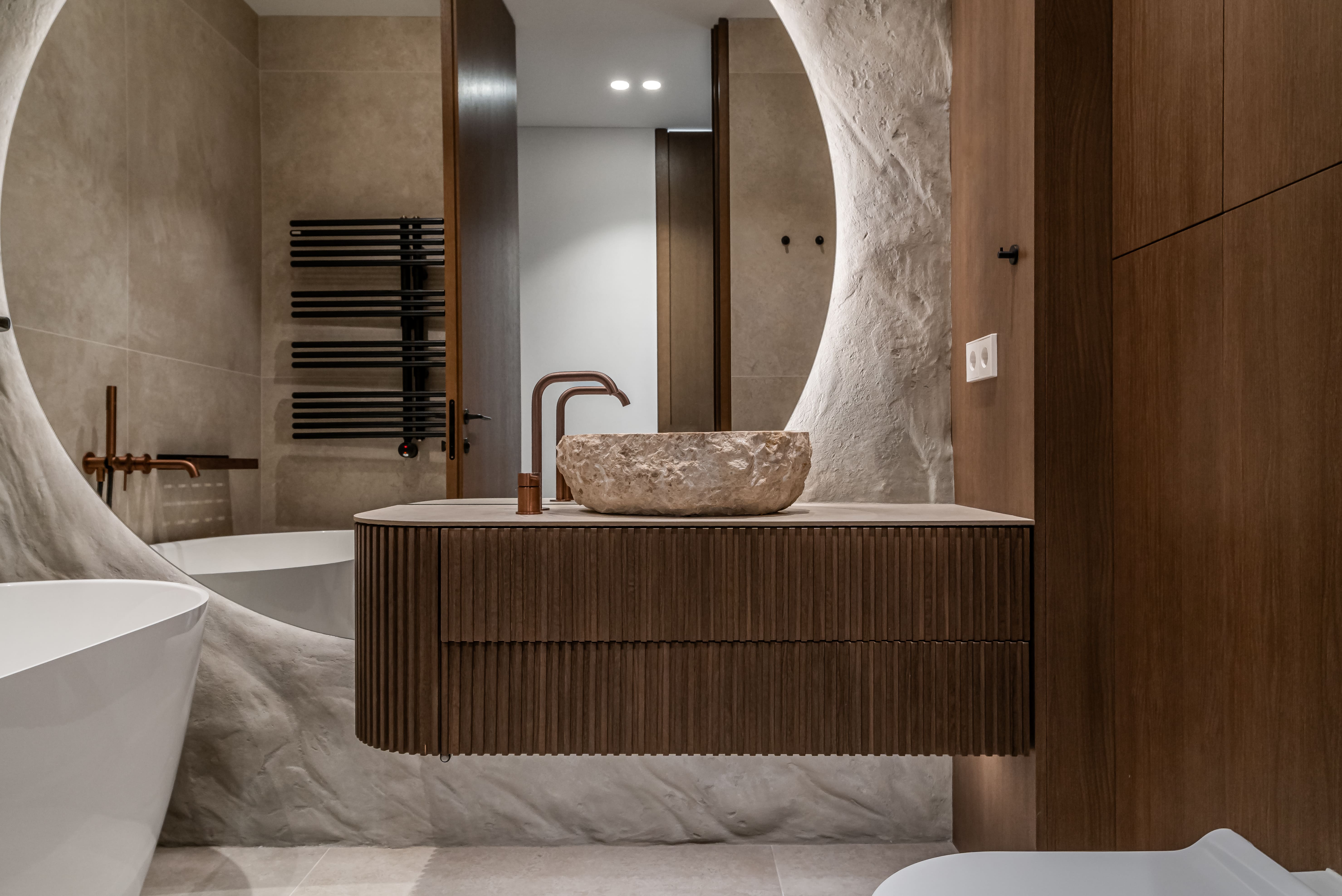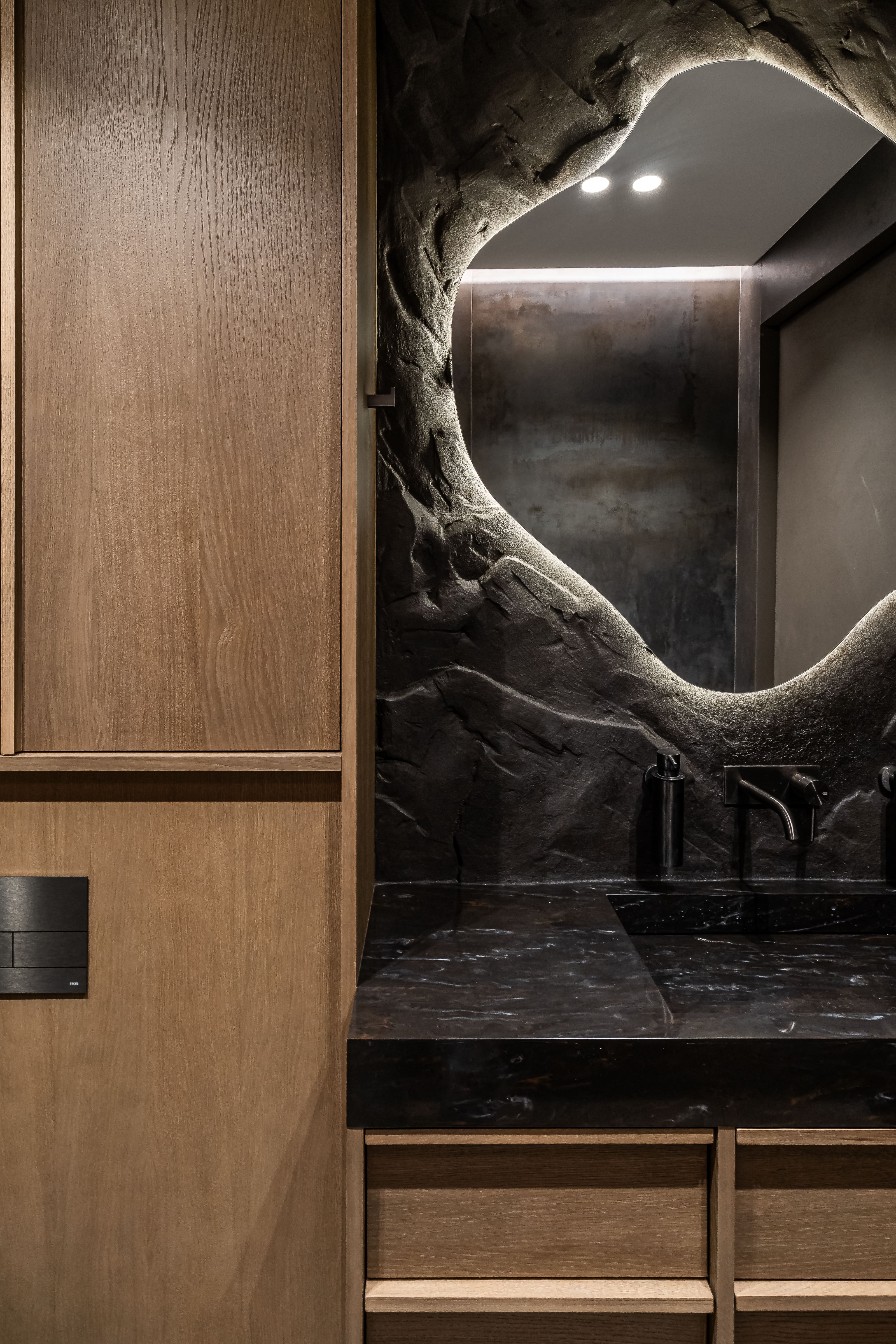 Beveik visi baldai šiame objekte gaminami pagal individualų užsakymą iš ąžuolo faneruotės, dengtos skirtingais beicais, nevengiamas plokštės lenkimas, medinių tašelių klijavimas. Voniose naudojama speciali uolienos efektą kurianti akcentinė sienų danga, ji derinama tiek su standartinio matmens, tiek su plačiaformatėmis akmens masės plytelėmis, beveik dviejų metrų skersmens veidrodžiu, spalvota santechnika PVD apdaila. Natūralūs tonai, medžio panaudojimas atsikartoja ir miegamojo kambaryje, kur kuriama jauki, gamtos motyvais paremta aplinka, kurioje gera pradėti ir baigti dieną.