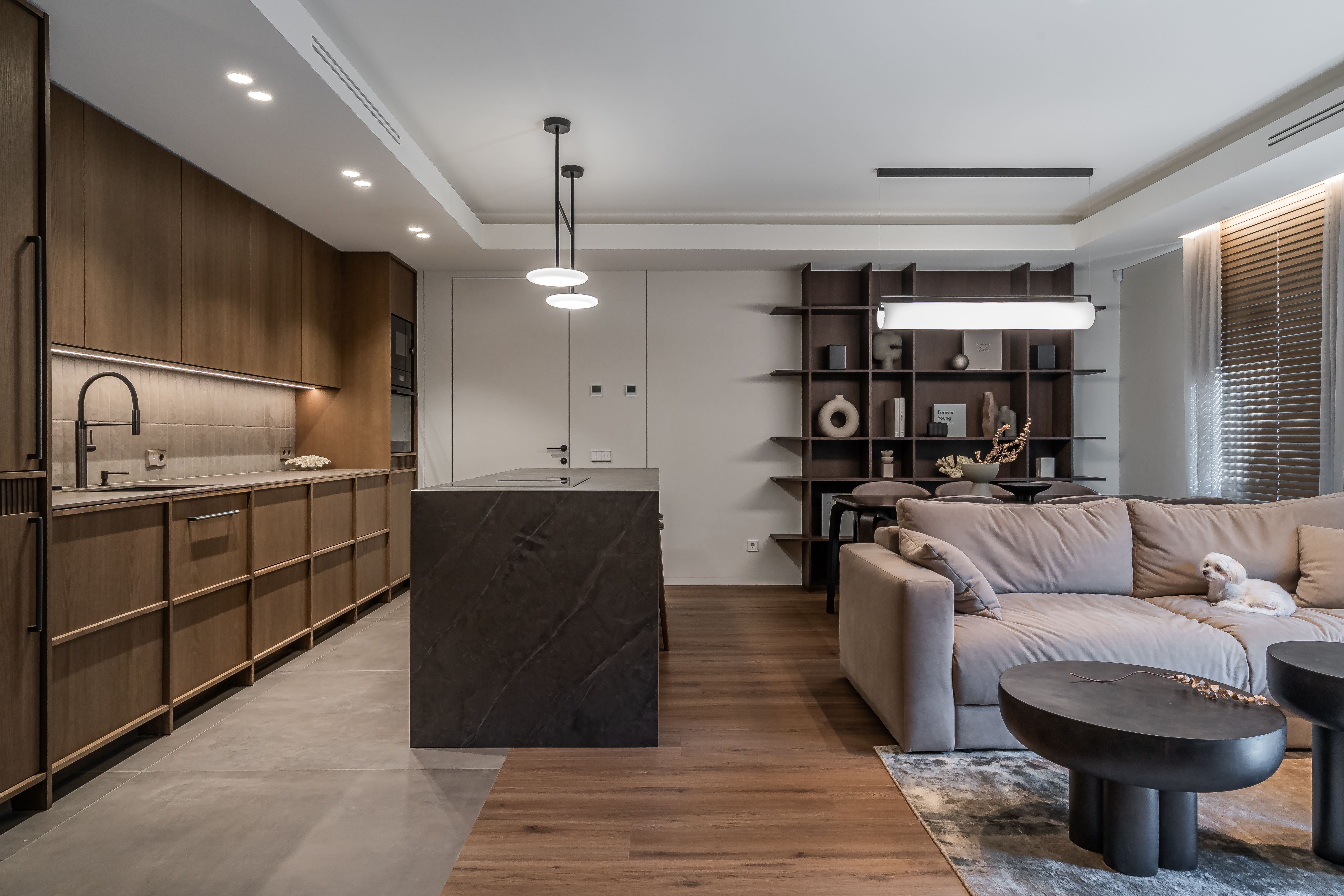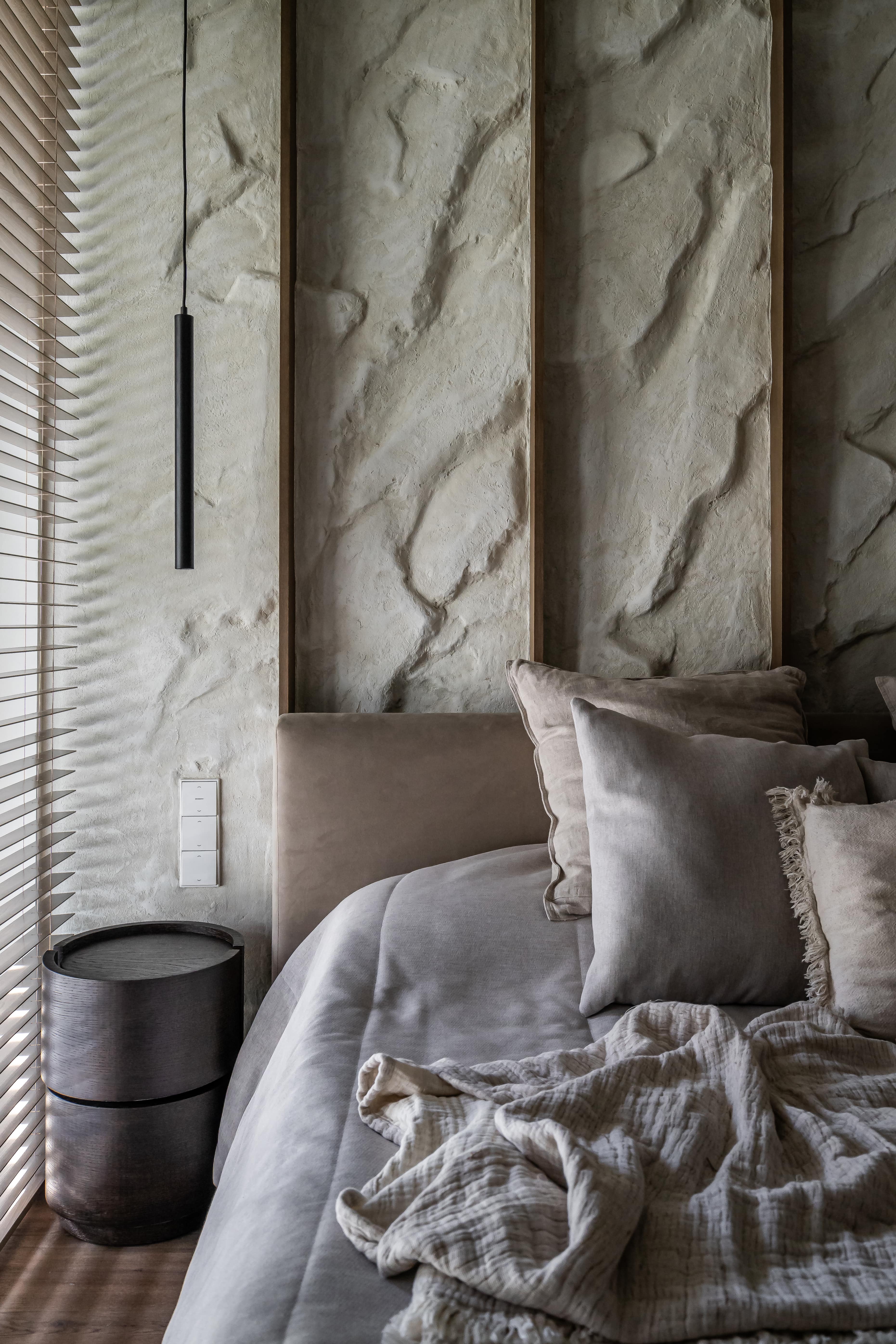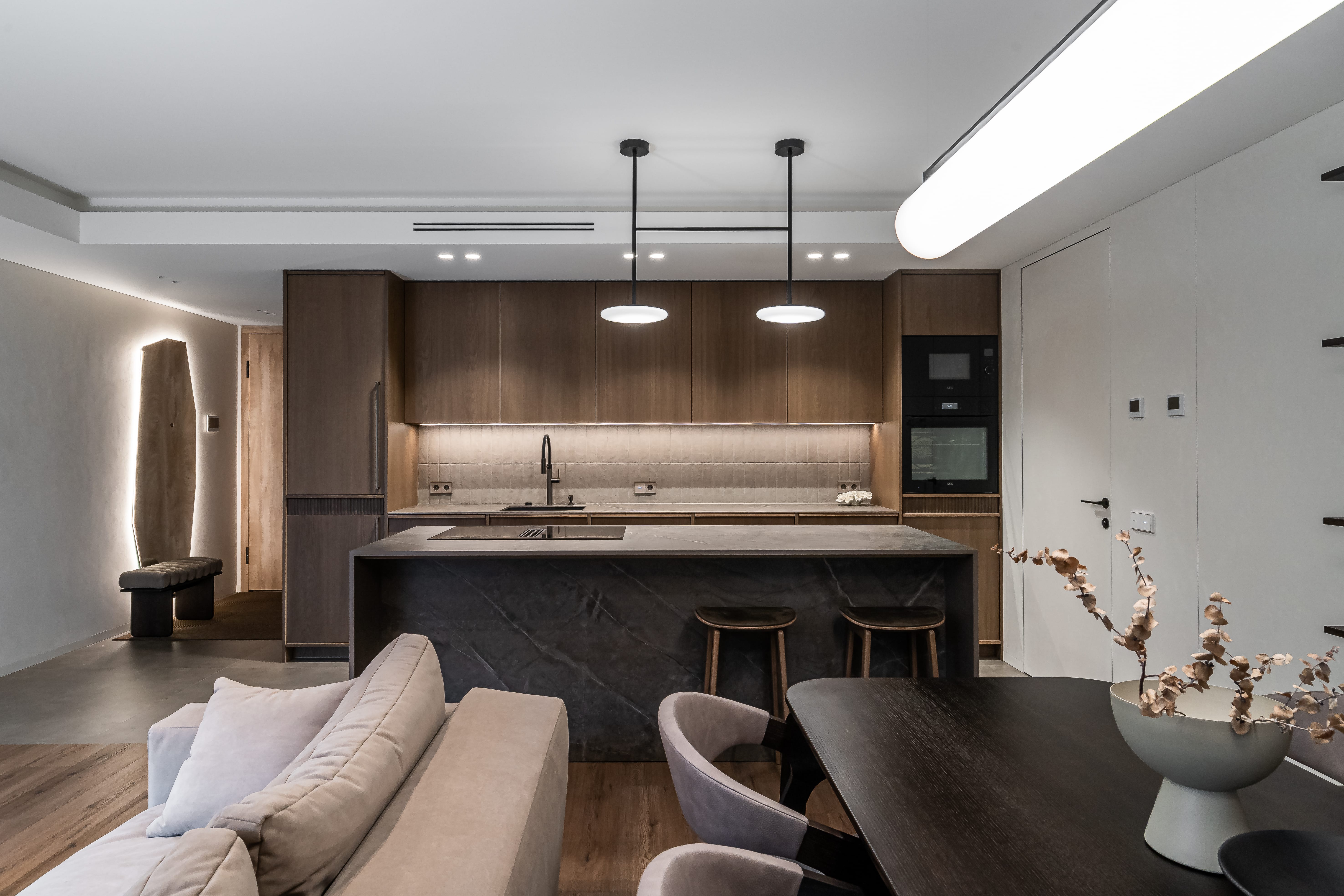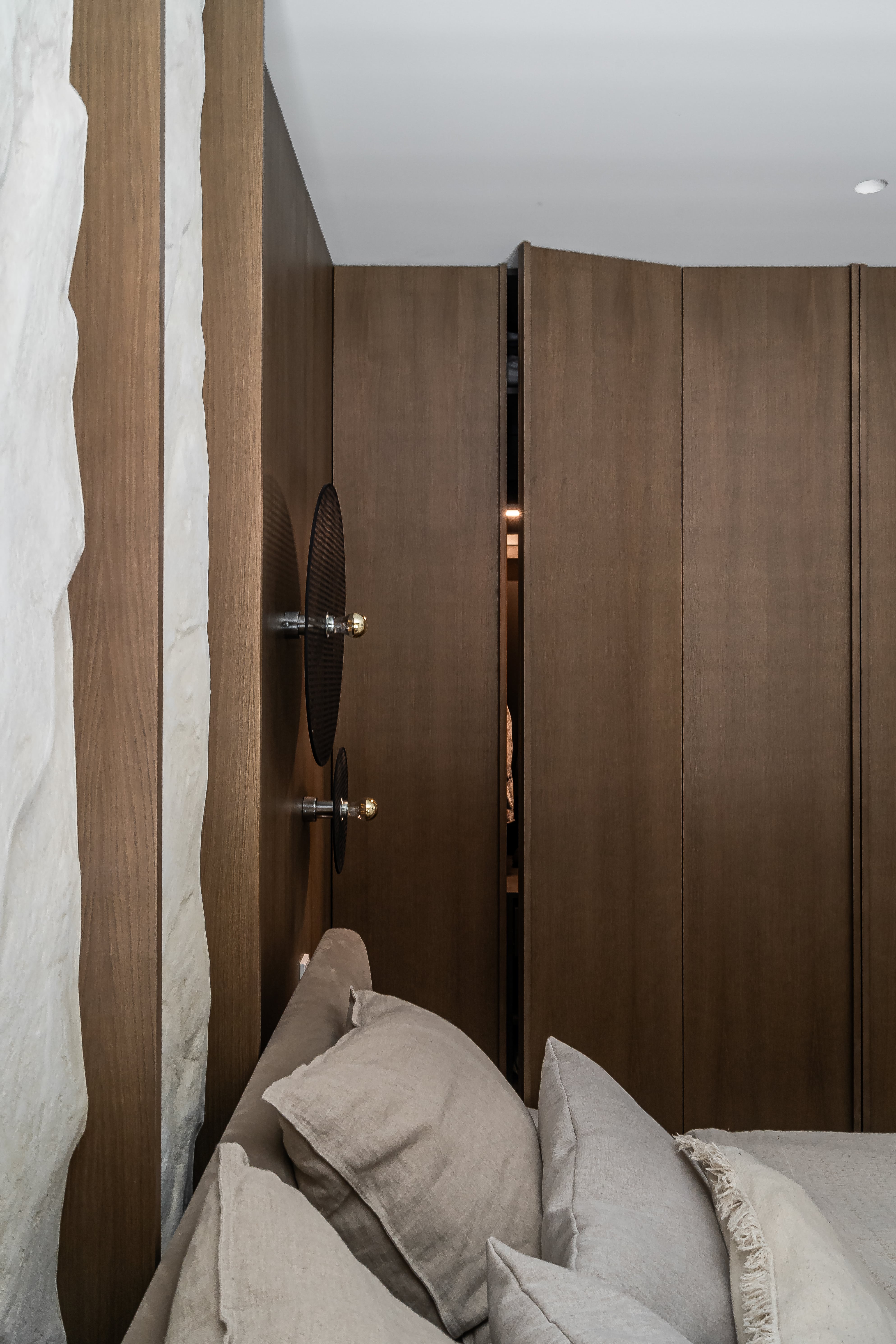 Beveik visi baldai šiame objekte gaminami pagal individualų užsakymą iš ąžuolo faneruotės, dengtos skirtingais beicais, nevengiamas plokštės lenkimas, medinių tašelių klijavimas. Voniose naudojama speciali uolienos efektą kurianti akcentinė sienų danga, ji derinama tiek su standartinio matmens, tiek su plačiaformatėmis akmens masės plytelėmis, beveik dviejų metrų skersmens veidrodžiu, spalvota santechnika PVD apdaila. Natūralūs tonai, medžio panaudojimas atsikartoja ir miegamojo kambaryje, kur kuriama jauki, gamtos motyvais paremta aplinka, kurioje gera pradėti ir baigti dieną.