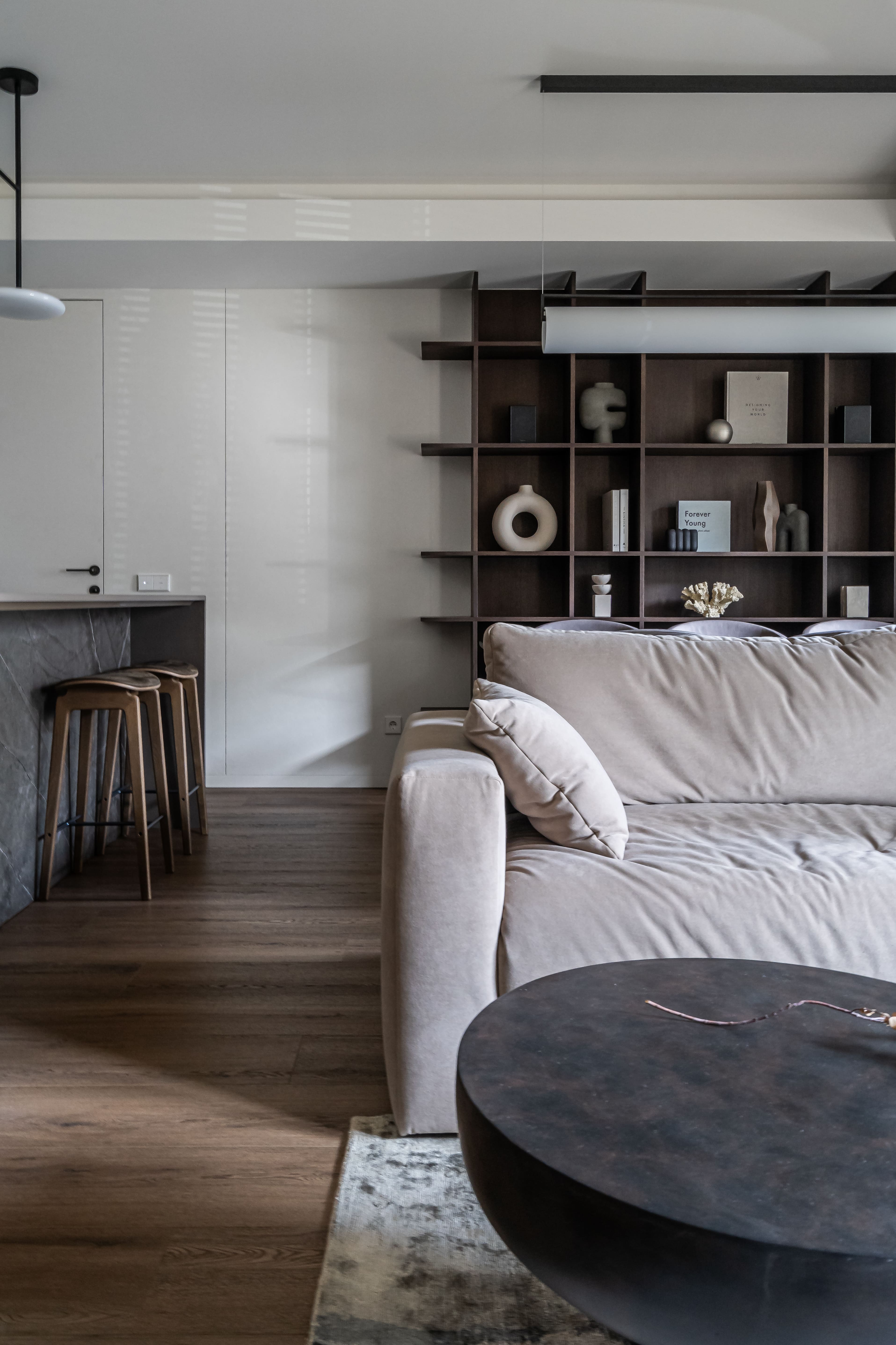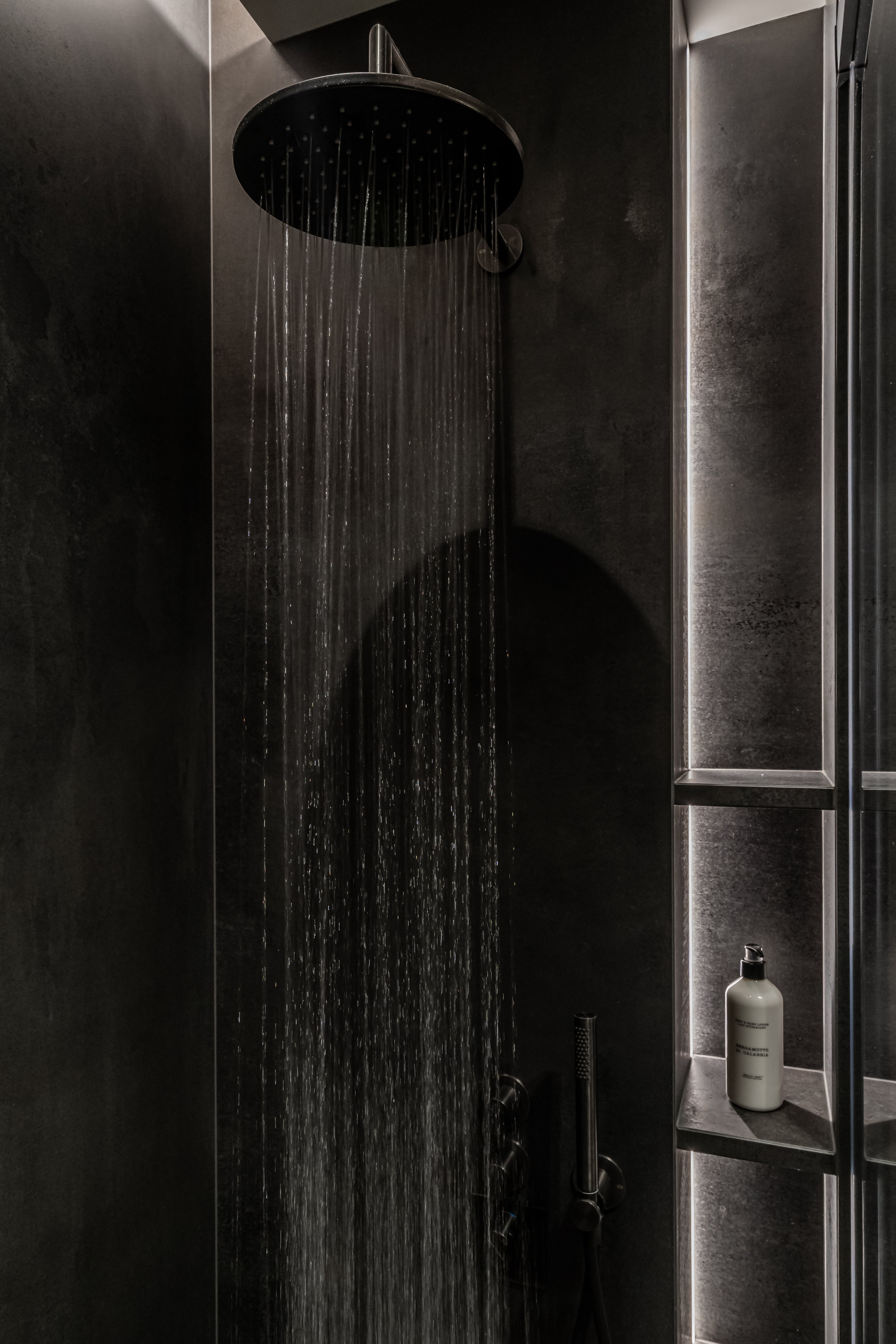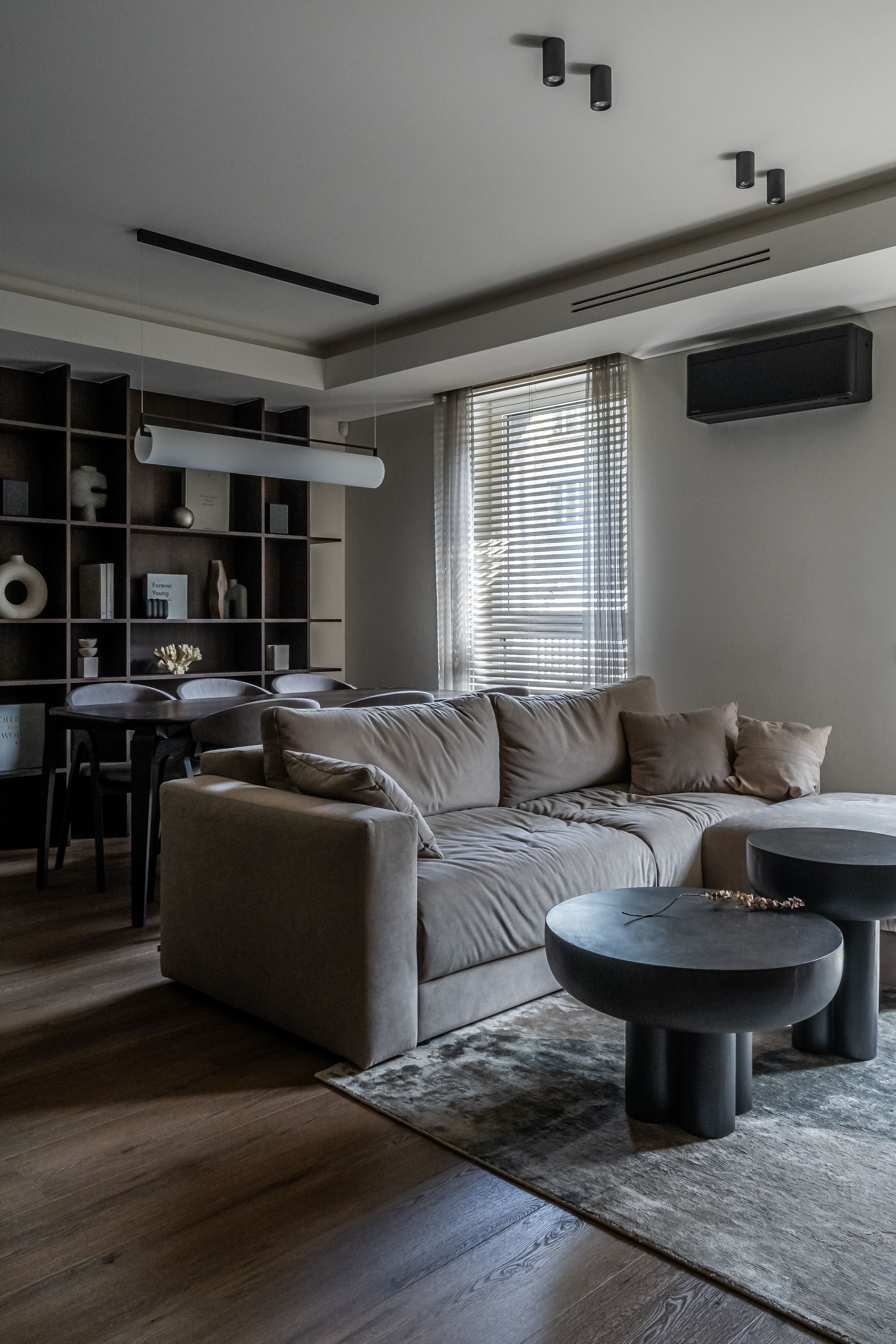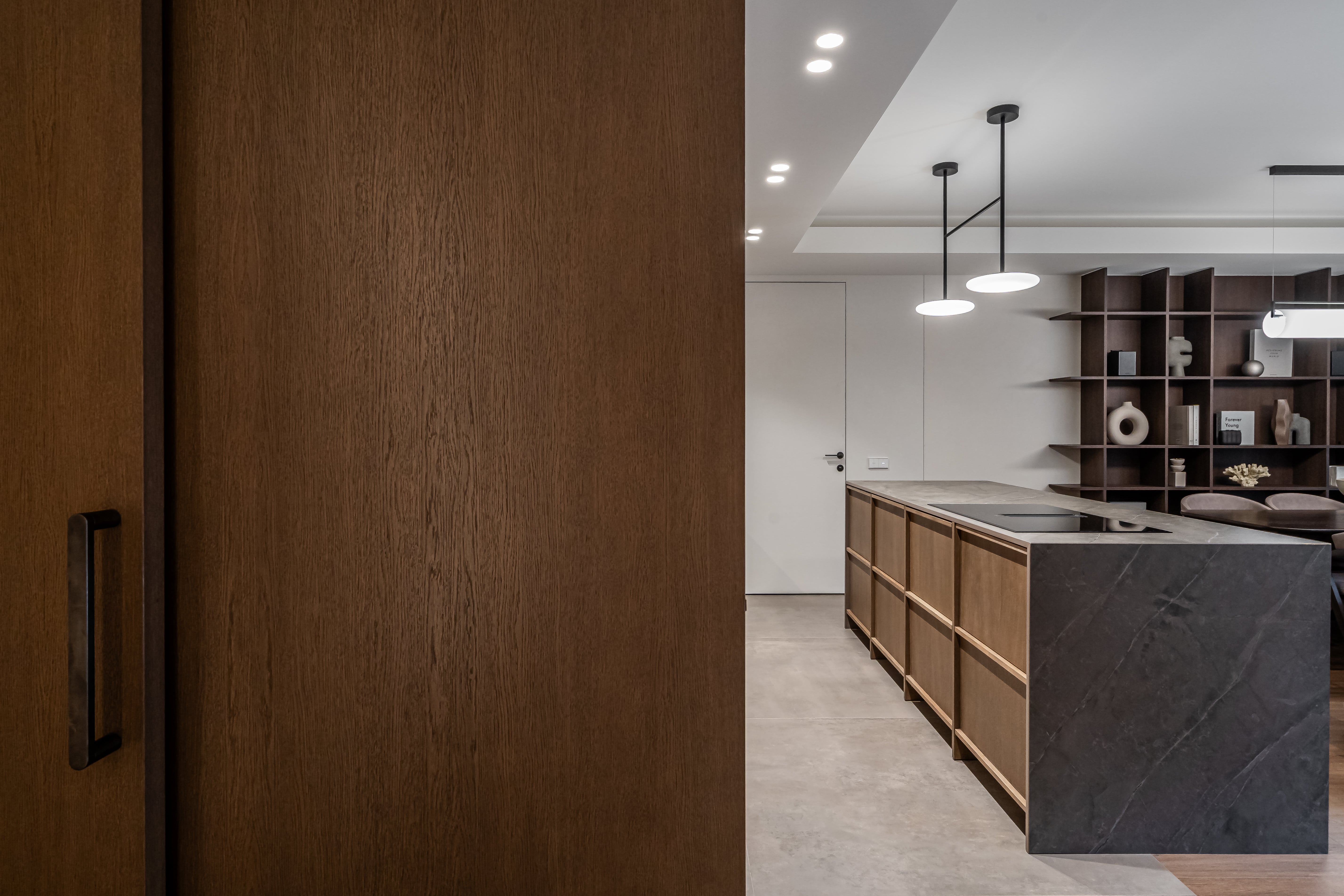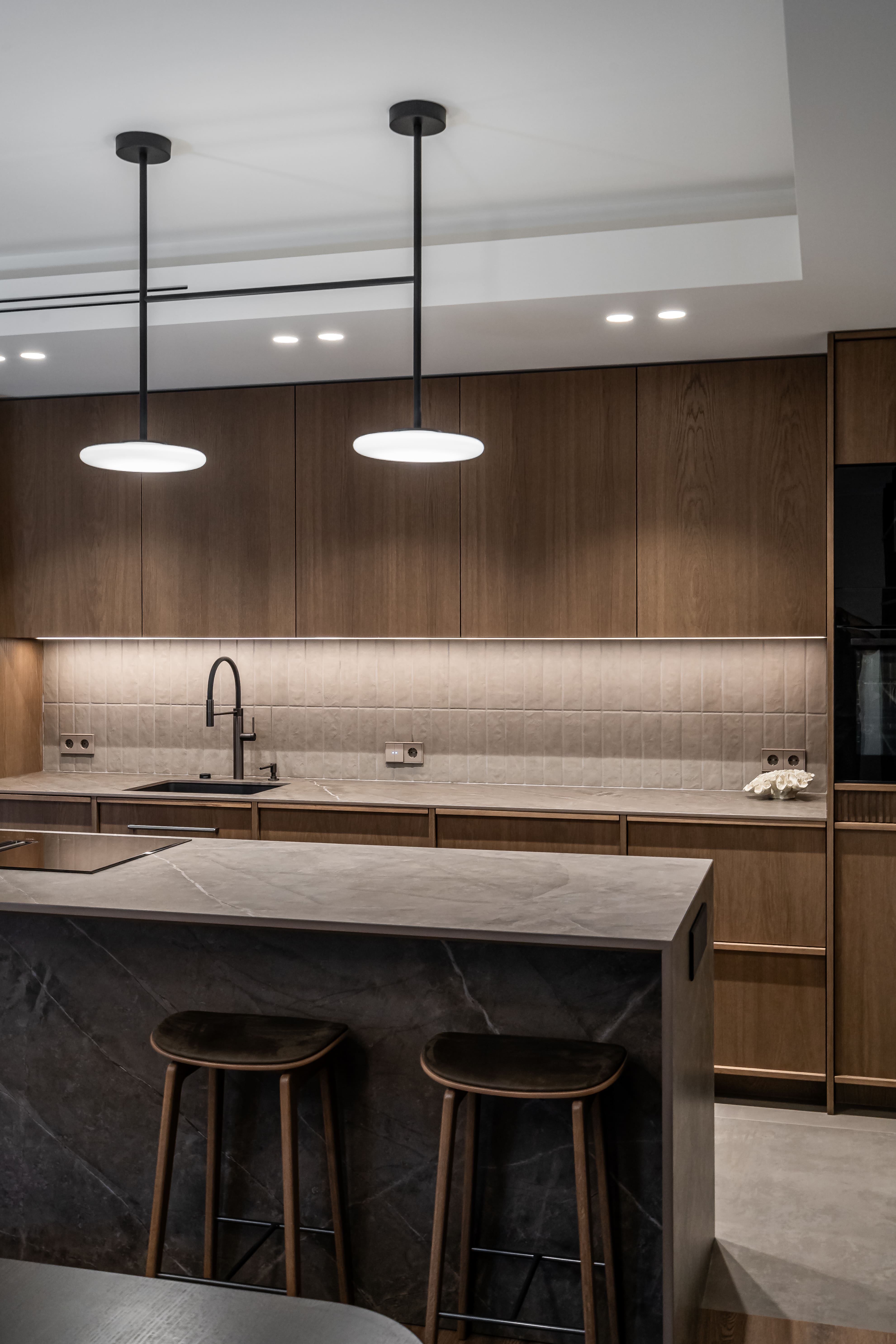 Beveik visi baldai šiame objekte gaminami pagal individualų užsakymą iš ąžuolo faneruotės, dengtos skirtingais beicais, nevengiamas plokštės lenkimas, medinių tašelių klijavimas. Voniose naudojama speciali uolienos efektą kurianti akcentinė sienų danga, ji derinama tiek su standartinio matmens, tiek su plačiaformatėmis akmens masės plytelėmis, beveik dviejų metrų skersmens veidrodžiu, spalvota santechnika PVD apdaila. Natūralūs tonai, medžio panaudojimas atsikartoja ir miegamojo kambaryje, kur kuriama jauki, gamtos motyvais paremta aplinka, kurioje gera pradėti ir baigti dieną.