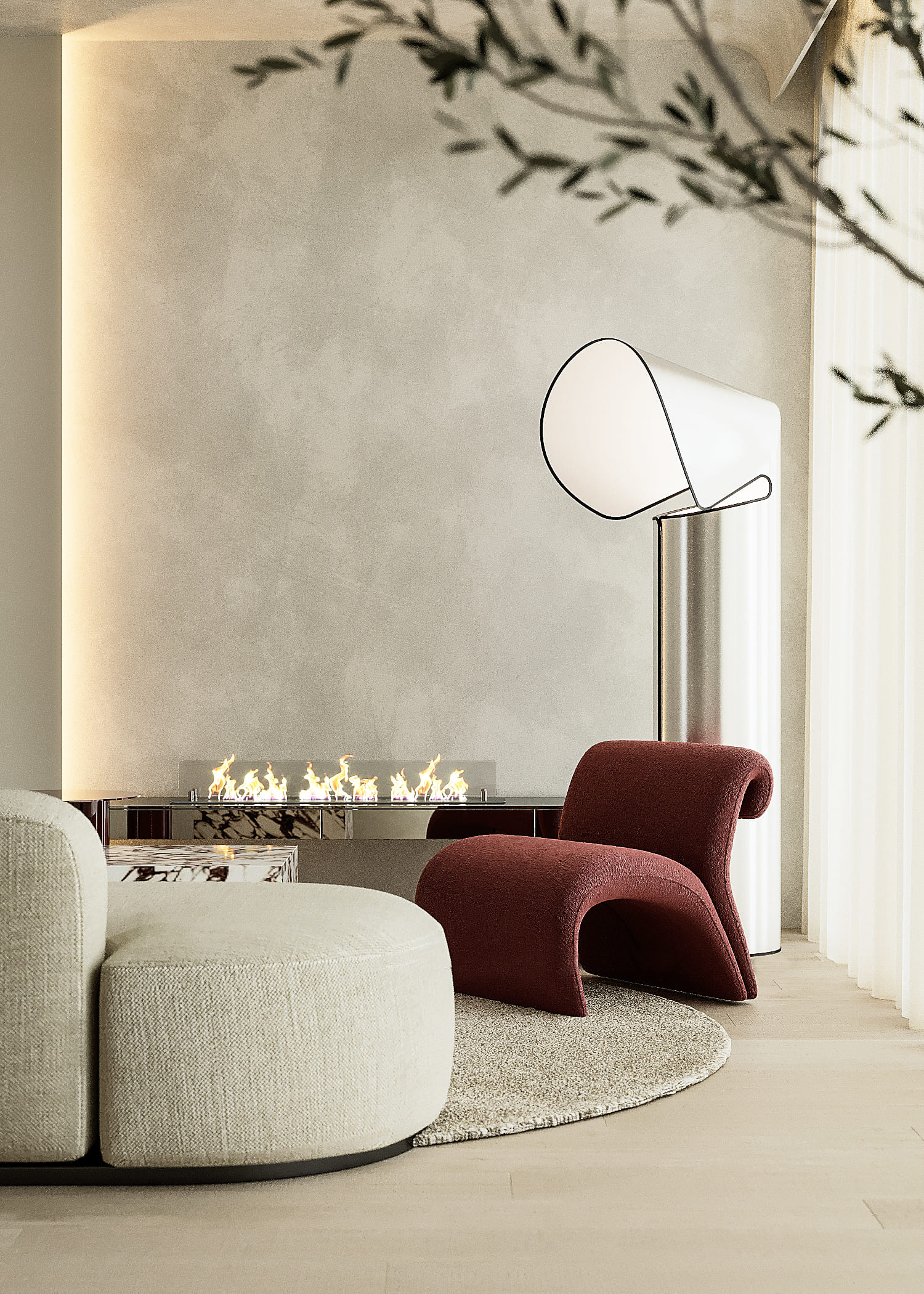Interjere naudotos aukštos kokybės natūralios medžiagos, įskaitant ąžuolo parketą, molio tinką, akmens masės plyteles, lenktus sienų dekorus ir ąžuolo faneruotę baldų fasadams. Bendroji spalvų paletė yra šilta, jauki ir šviesi, puikiai deranti su ryškiai raudonomis detalėmis. Būtent raudonos spalvos motyvas tampa per visus namus atsikartojantis stebinantis ir kartu drąsų užsakovų stilių pabrėžiantis meninis akcentas. Vila Kipre yra puikus pavyzdys, kaip prabanga ir natūralus grožis gali susijungti per interjero dizaino projektą.
